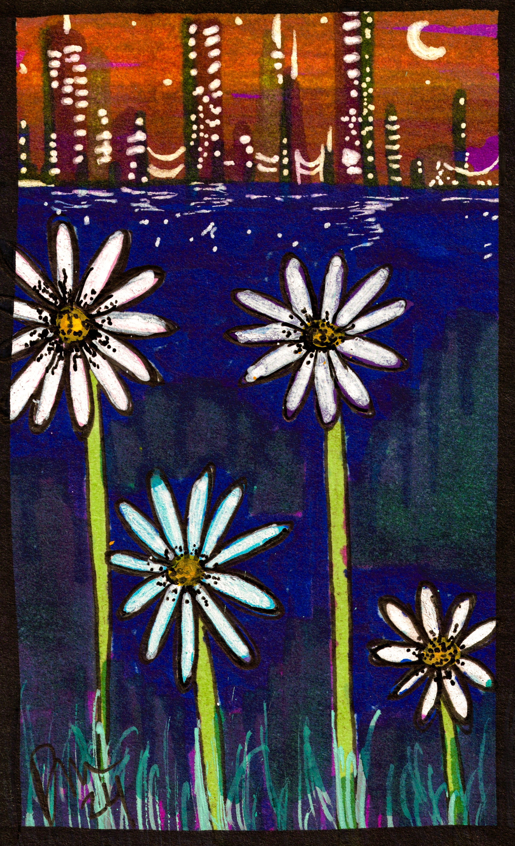 Created with alcohol markers, acrylic markers, micron pens, and gel pens. I grew up looking across the water at this city called Seattle. Now that I live in it I get to reflect fondly upon the memories of what it was like to just look across and see it's glow, it's reflection on the water, and the mystery it always held of the CITY LIFE. While I picked daisies and dreamed of the future that awaited me outside of the vastness and solitude of suburban/country lifestyle. Also, technically part of the Spooky Collection of 2024.